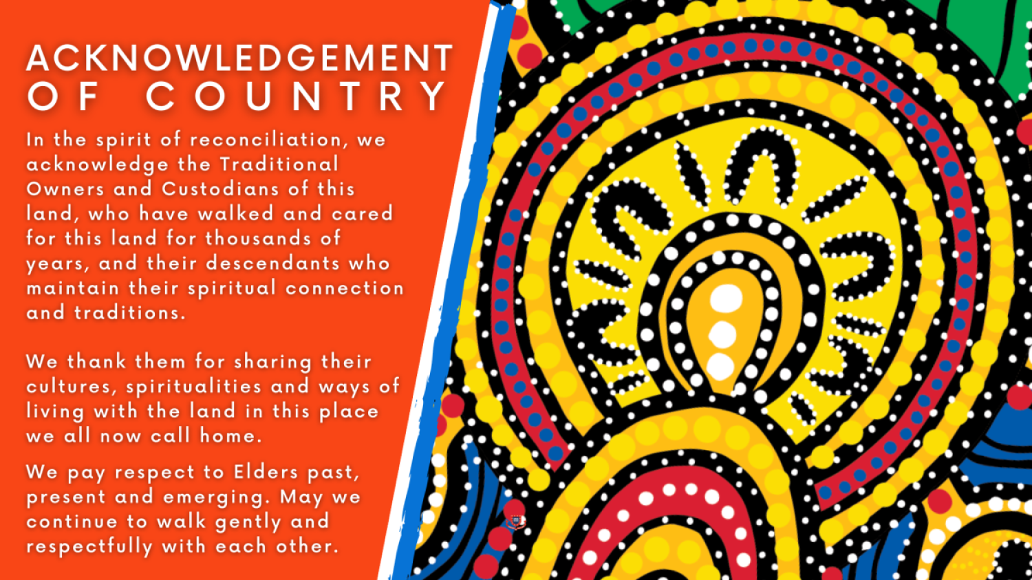 We acknowledge the continued deep spiritual attachment and relationship attachment and relationship of Aboriginal and Torres Strait Islander Peoples to this country and commit ourselves to the ongoing journey of reconciliation.