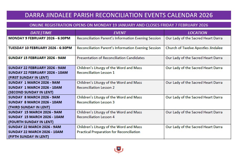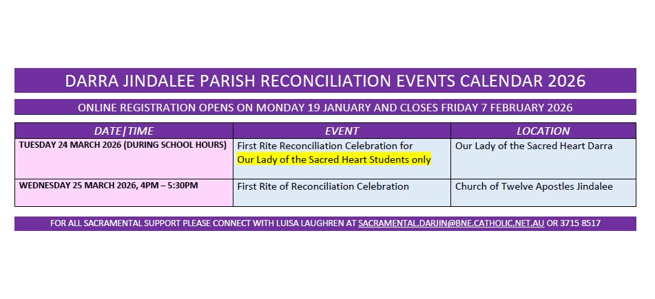 We welcome you to take part in this beautiful Sacrament of healing. Please see the newsletter for times or alternatively contact the Parish Office and book an appointment with the Parish Priest.